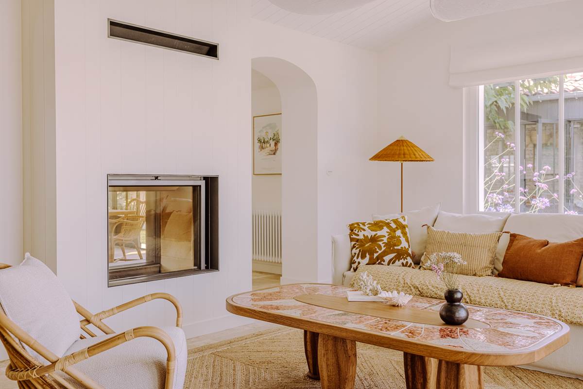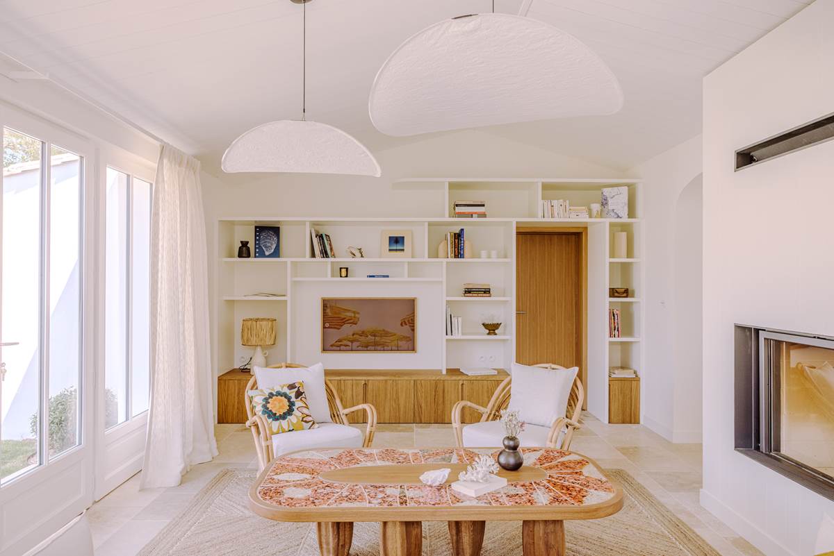 Grand salon lumineux avec cheminée, ouvert sur le jardin et la piscine