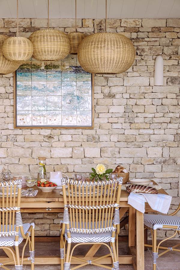 Auvent d'été avec mur en pierres apparentes, parfait pour les repas ombragés ou les moments de détente
